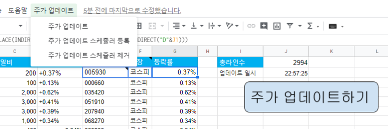 주가 업데이트를 선택하면 실제 updateStockValue() 함수가 실행되어 해당 수식을 새로 설정하고 주가를 가져 옵니다. 나머지 2개는 5분 마다 한 번씩 실행 되도록 예약된 작업에 등록 시키거나 제거하는 기능 입니다.