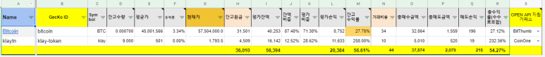 수익률 계산 수식은 주식관리와 비슷하며 암호화폐 정보를 가져오는 구글앱스크립트를(GAS) 함수의 활용이 핵심입니다. GAS를 이해하신다면 충분히 분석하실 수 있을 것입니다
