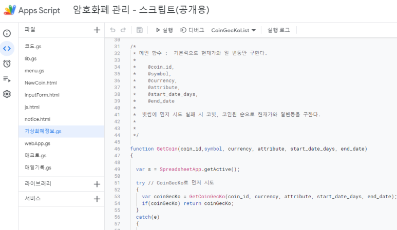 암호화폐 거래소의 OPEN API를 이용하여 현재가 및 등락률을 가져오는 함수를 만들었는데 스크립트 에디터에 있습니다.