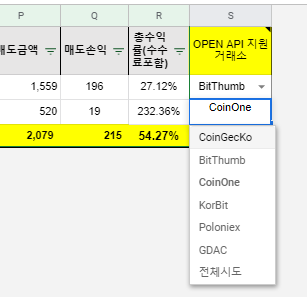 S 열에 보시면 거래소를 지정하게 되어 있는데 해당 거래소에서 접속하여 현재가/등락률등의 정보를 가져 옵니다. 거래소에서 지원하지 않는다면 CoinGecKo 나 전체 시도를 선택하면 됩니다.