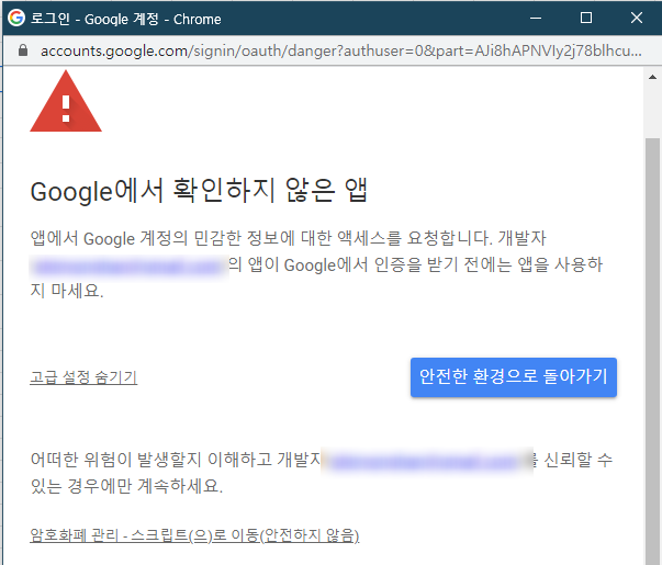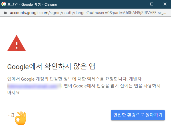 구글 계정을 선택한 후 구글에서 확인하지 않은 앱에서 좌측하단에 고급을 누르고
