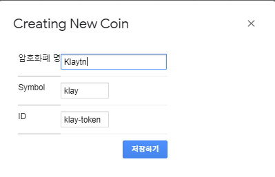 메뉴에서 새코인 생성을 누릅니다. 예를 들어 Klay를 검색한다면 다음과 같이 검색이 되어 3개 정도 나올 겁니다. 2번째 인 클레이튼을 선택하면 Symbol 이 CoinGecKo 로 부터 검색하여 다음과 같이 채워지게 됩니다. ID 는 코인 갯코의 Coin-id 입니다.