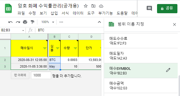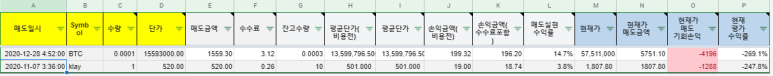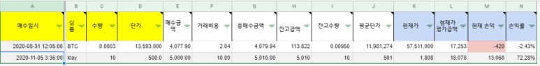 최근 암호화폐를 거래 하면서 수익률을 관리할 수 있도록 스프레드 시트를 만들고 있습니다. 주식과 비슷하기에 해외주식 시트를 수정하여 만들면 될 것 같아 준비중에 있습니다. 제일 문제점