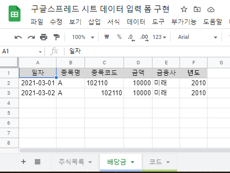구글 스프레드시트에서 입력 폼을 구현하는 방법을 제가 만든 주식관리 시트에서 추출하여 정리해 보았습니다.