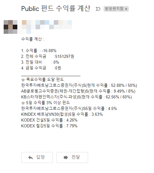 이번에 개선 한 기능은 recordHistory() 라는 일일 수익률 기록 함수가 하루에 한번 씩 실행 되는데 투자하고 있는 펀드에 이벤트가 발생하면 첫 화면인 "펀드종합" 시트와 이메일로 알려 주는 기능입니다.