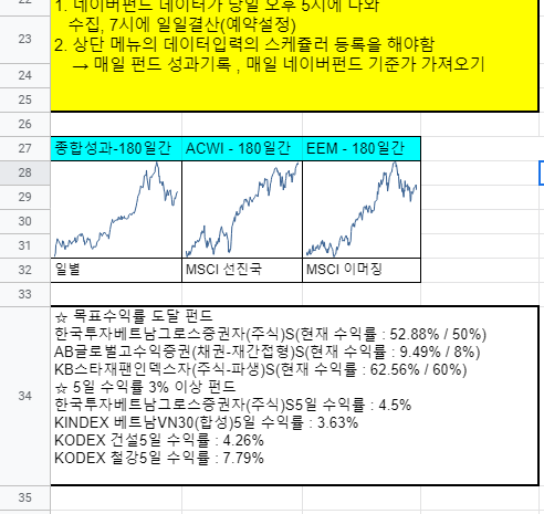 설정액 증가 펀드는 보유펀드기준가 시트의 5일 설정액 증감 정보를 이용하였습니다. 수식은 글 마지막에 언급 해 두었습니다 목표수익률 도달 펀드는 보유펀드 기준가의 H열에 목표 수익률을 직접 설정 해주었습니다 .