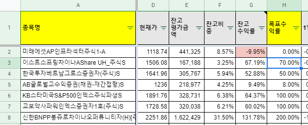 구글 스프레드 시트로 펀드 수익률 관리를 하고 있습니다.