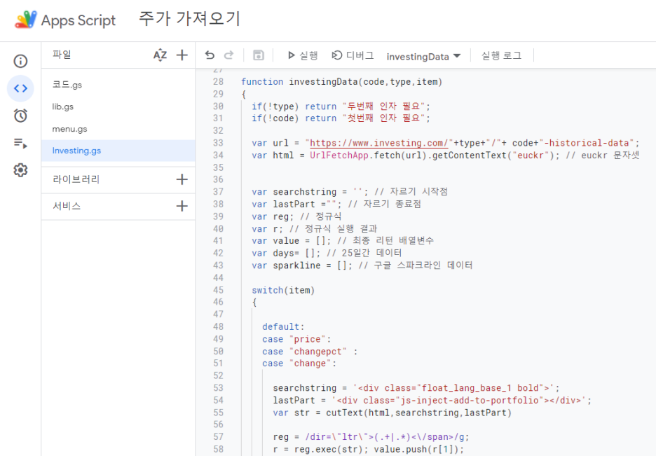 Investing.gs 라는 파일에 있습니다 코드.gs 에는 네이버 증권에서 수집하는 getNaverStock() 함수도 있습니다.
